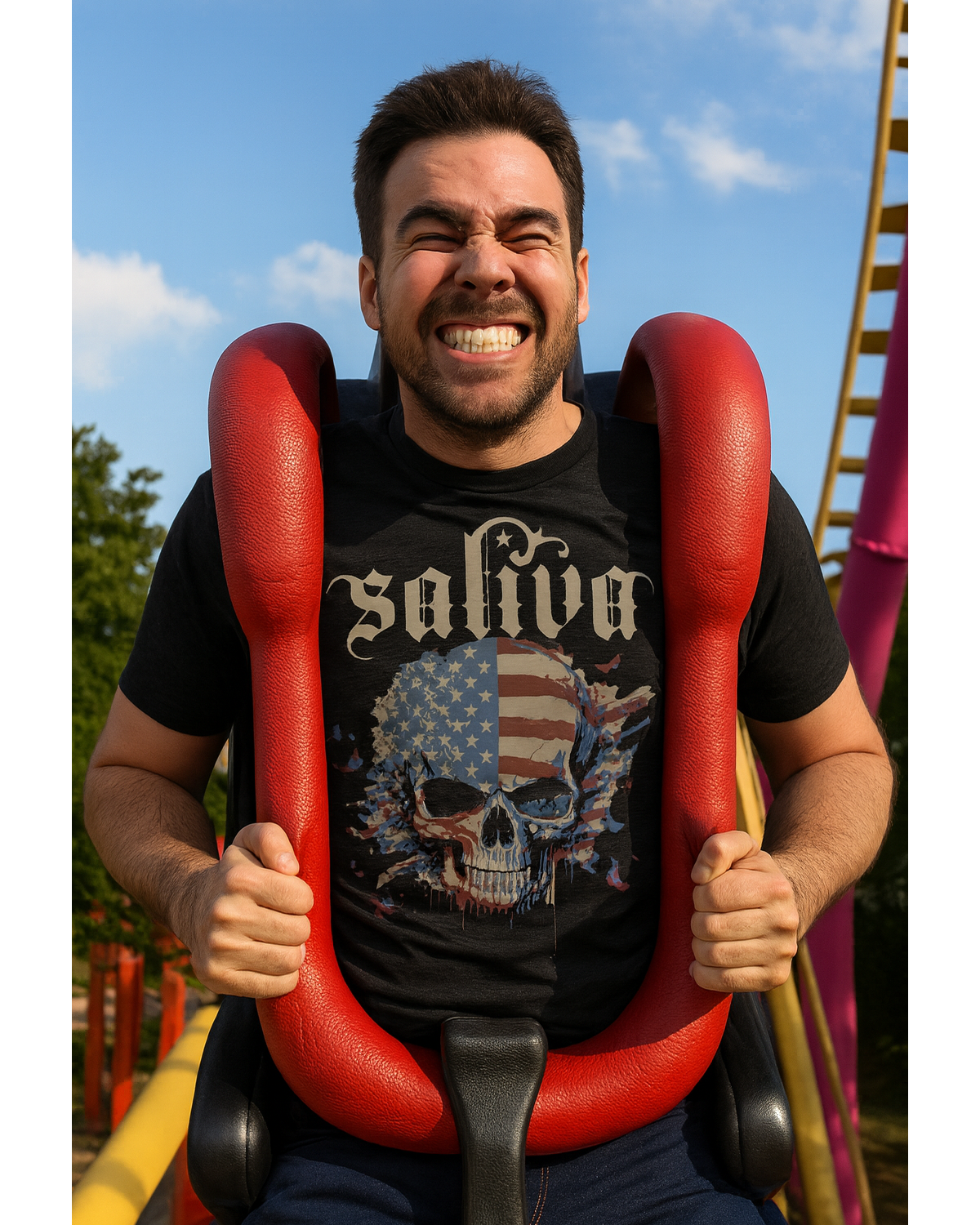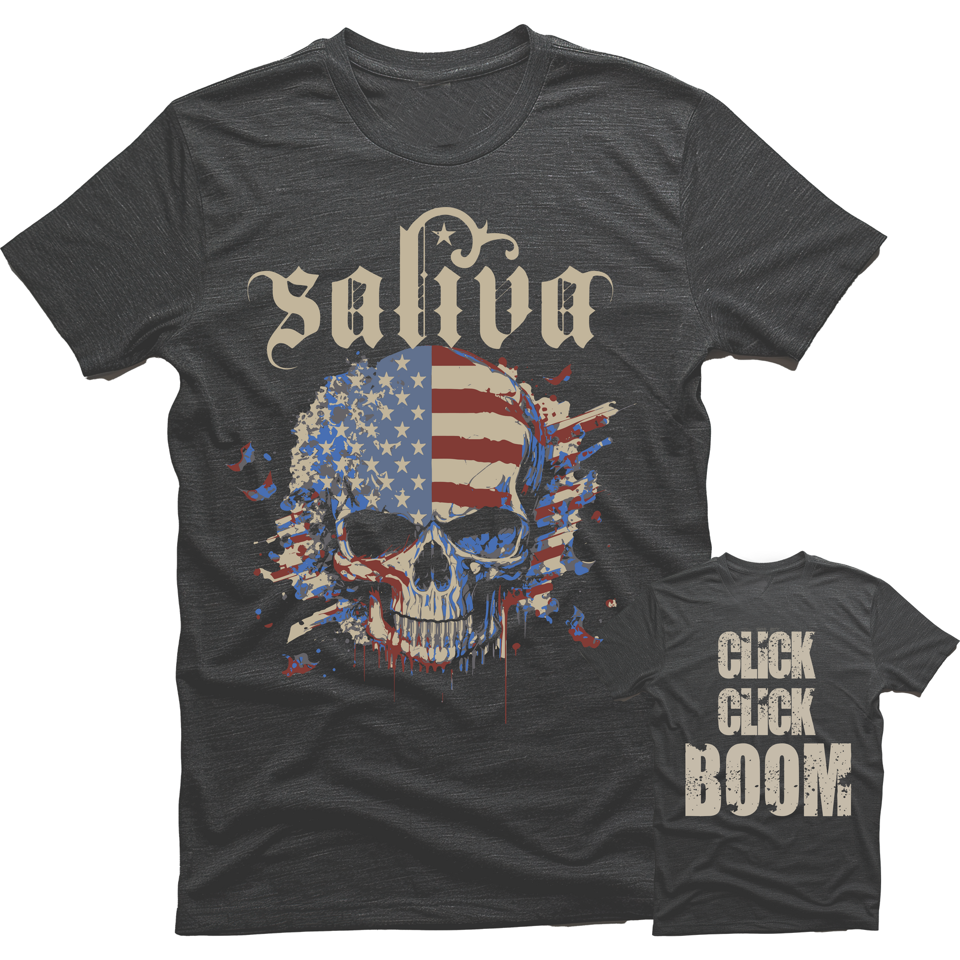 Saliva's best selling shirt. Front design features a skull flag design, the back design features the song title, "CLICK CLICK BOOM"