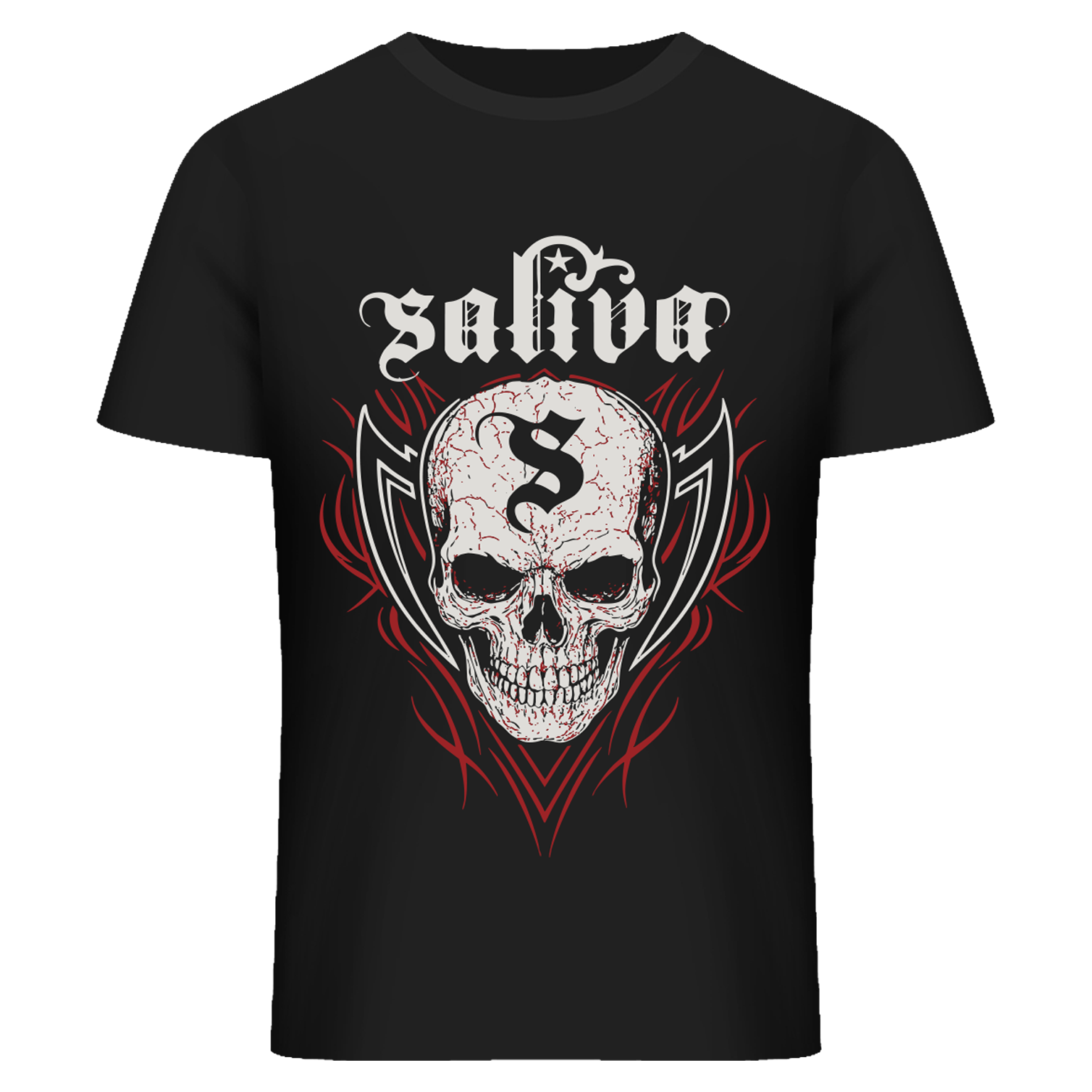 - Front print featuring Saliva logo, skull graphic, and red accent artwork